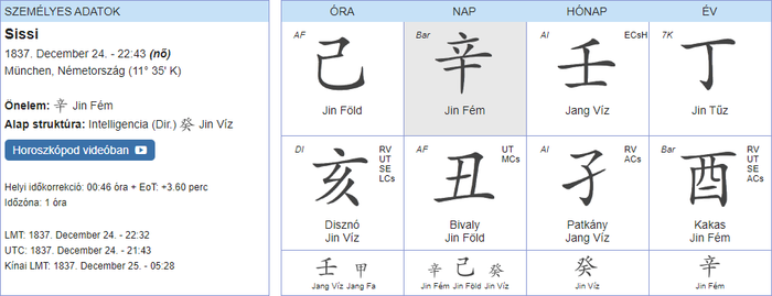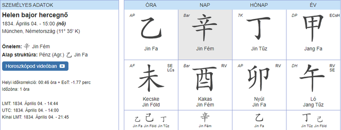 Helen egy jin fém napon született. Számára fontos lehetett, hogy kitűnjön, hogy észrevegyék. Egy jin fém szereti képezni magát, szeret új ismeretekre szert tenni. Az, hogy mit gondolnak róla az emberek, előrébb való szinte mindennél. Szinte biztos vagyok, hogy valóban nagy traumaként élhette meg Ferenc József visszautasítását, hiszen egy jin fém sem szereti, ha ennyire kínos helyzetbe hozzák őket..Számukra ez egyet jelent a teljes megsemmisüléssel!