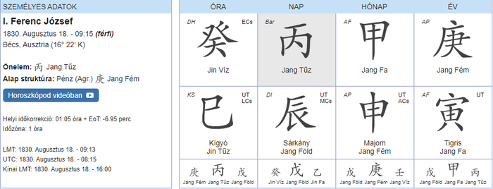Ferenc József egy jang tűz napon született. Egy jang tűz típusú embernek az inkarnációs feladata, hogy a változások fontosak és a fejlődést szolgálják. Rutinorientált és munkamániás.